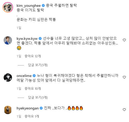 그는 "중국 추월하면 탈락. 중국 이겨도 탈락. 문화는 카피, 심판은 짝퉁"이라며 상당히 수위 높은 발언도 남겼습니다. 방송인 안혜경도 "진짜 ..보다가 ..🔥🔥🔥🔥진짜.. 보다가.."라며 분노 글에 호응했습니다.
