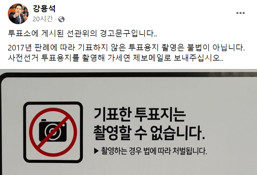 강용석 변호사는 3월 4일 본인의 페이스북을 통해 선관위의 경고문구를 소개하며 "2017년 판례에 따라 기표하지 않은 투표용지 촬영은 불법이 아닙니다. 사전선거 투표 용지를 촬영해 가세연 제보 메일로 보내달라"고 요청해 논란이 일었습니다.
