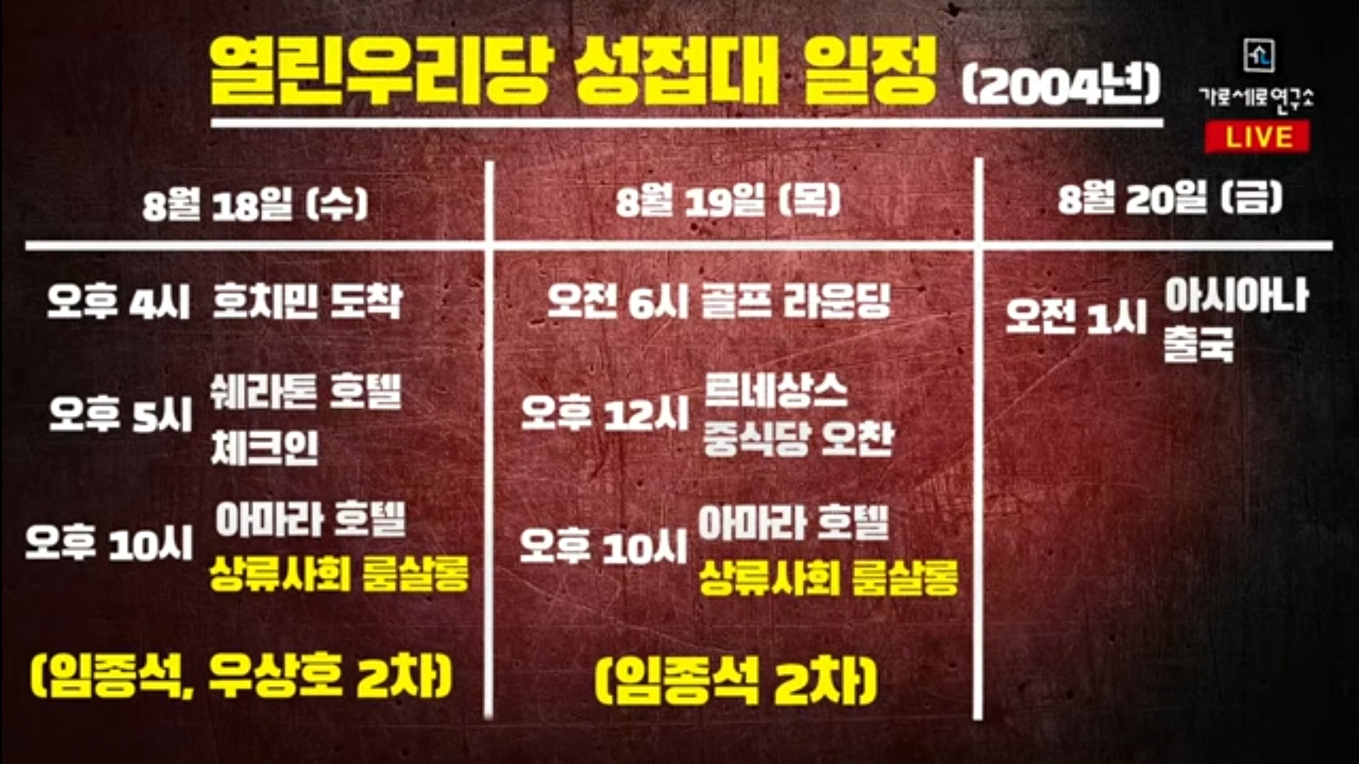 가세연은 "SK텔레콤 출신 제보자 E씨로부터 당시 스케줄이 상세히 기록된 '접대 일정표'를 입수했다"며 "'열린우리당 대외경제협력 특별위원회 위원단 베트남 방문 일정'이라고 쓰여진 이 일정표에는 열린우리당 의원들이 2004년 8월 18일 오후 4시 베트남 호치민시에 도착해 8월 20~21일 아시아나 비행기로 출국할 때까지의 모든 일정이 기록됐다"고 밝혔습니다.