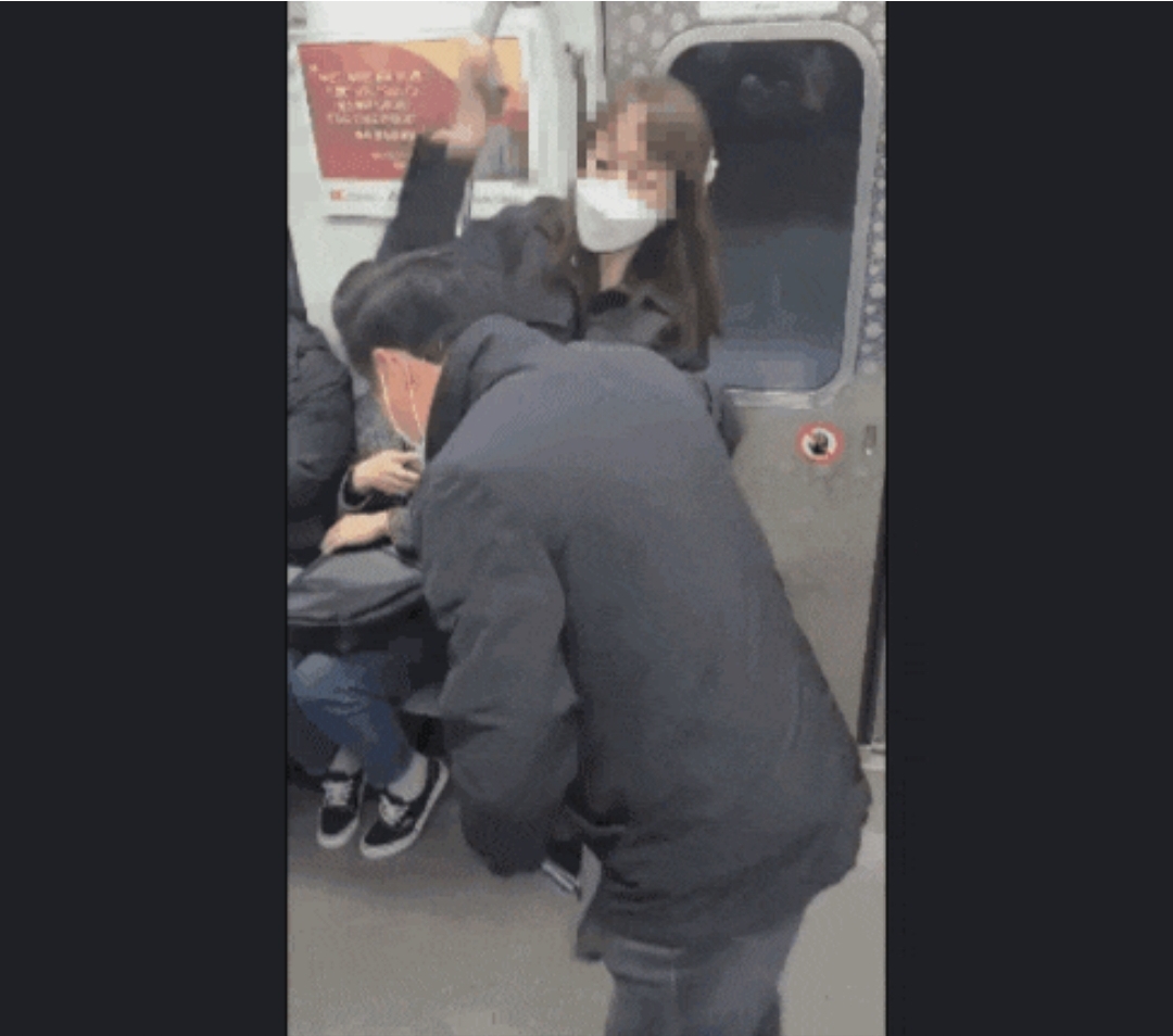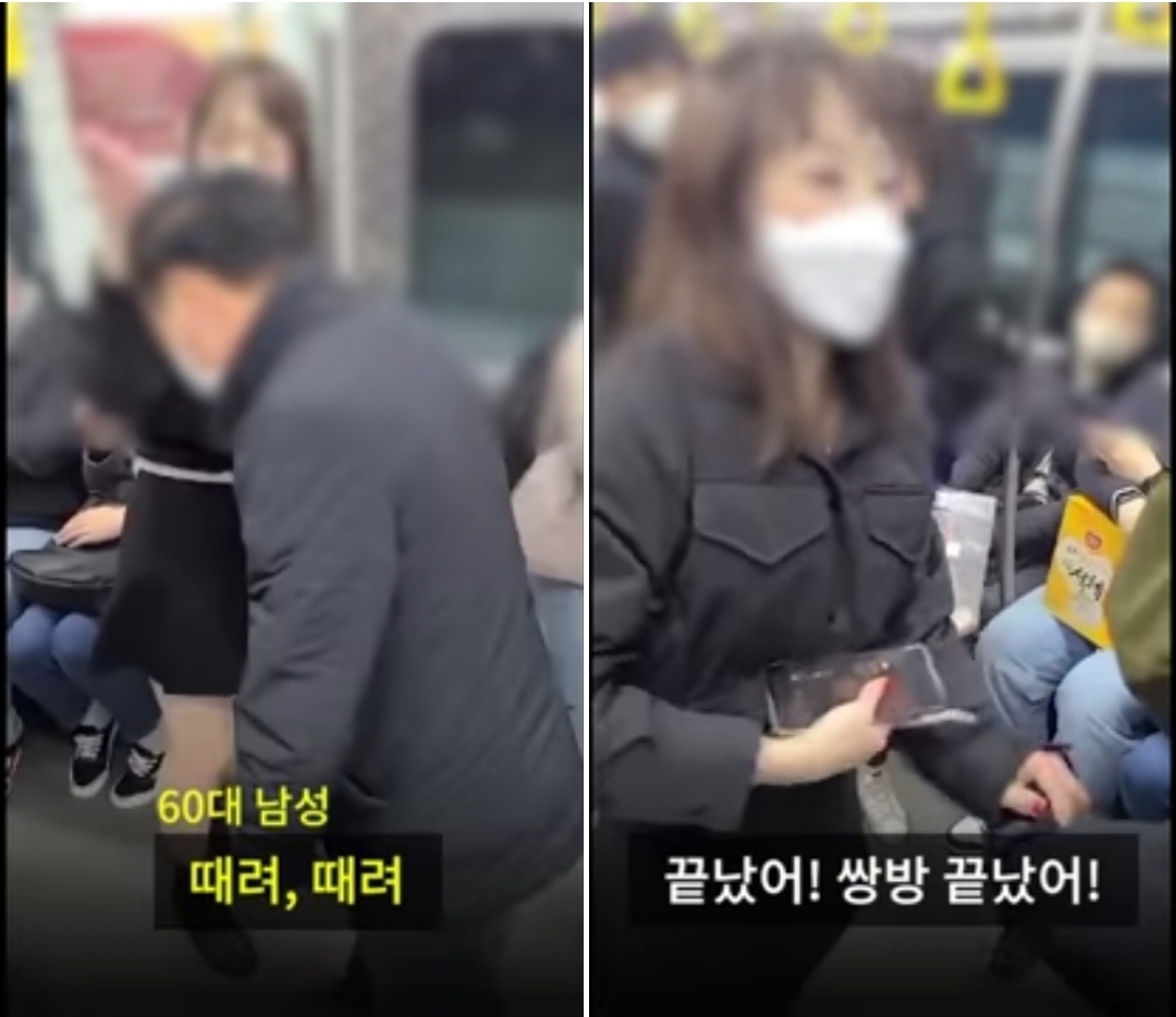 이후에도 이 여성이 계속해서 남성의 머리 위로 휴대폰을 올리며 위협하자 옆에 있던 시민이 남성의 머리를 손으로 가리면서 제지했습니다.