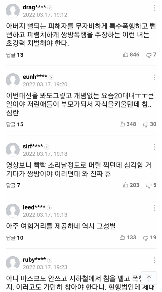 해당 기사 댓글 창에는 "아버지 뻘되는 피해자를 무자비하게 특수폭행하고 뻔뻔하고 파렴치하게 쌍방폭행을 주장하는 이런 녀는 초강력 처벌해야 한다". "개념없는 요즘20대녀ㅜㅜ큰일이야 저런애들이 부모가되서 자식을키울텐데 참.. 심란", "영상보니 빡빡 소리날정도로 머릴 찍던데 심각함 거기다가 쌍방이야 이러던데 와 진짜 휴", "근데 저걸 어떻게 참았데? 대단한 아저씨네" ,"가정교육이 이래서 중요하다. 말 할 값어치가 없다. 마음의 상처 빨리 치유되길 바랍니다.어르신." ,"와 레전드다 ㅋㅋㅋㅋㅋ 휴대폰 모서리로 풀파워 가격하고있네, 살인미수 적용되라.." 등의 반응이 이어지고 있습니다.