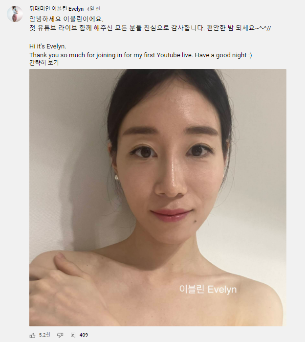 이블린은 자기소개 글에서 "저는 평범한 일반인이다. 채널을 개설한 이유는 제 안에 있는 숨어있는 끼를 마음껏 표현하고 싶어서 만들게 됐다"라고 말했습니다.